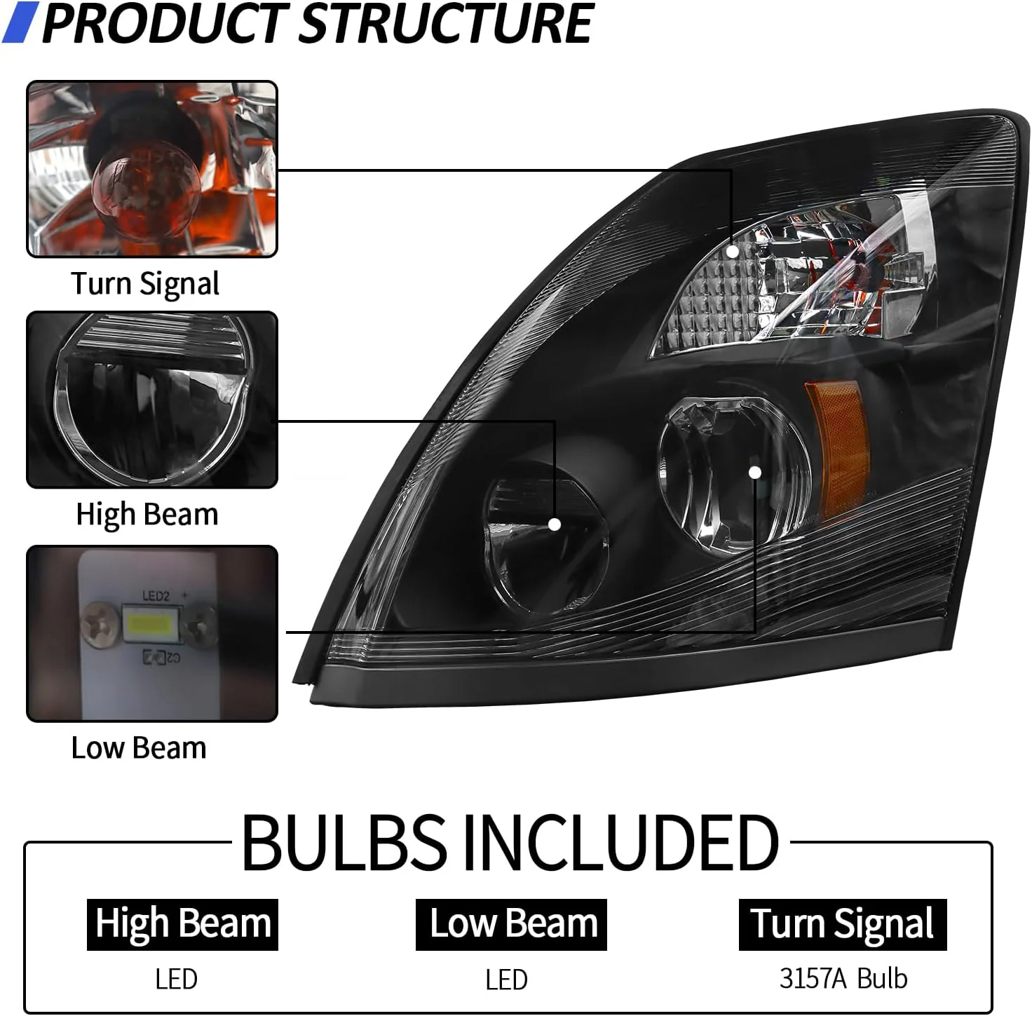 Product Name: LED Headlight Assembly for Volvo VNL 2004-2014, Black Factory Style LED High/Low Beam Headlights for Driver and Passenger